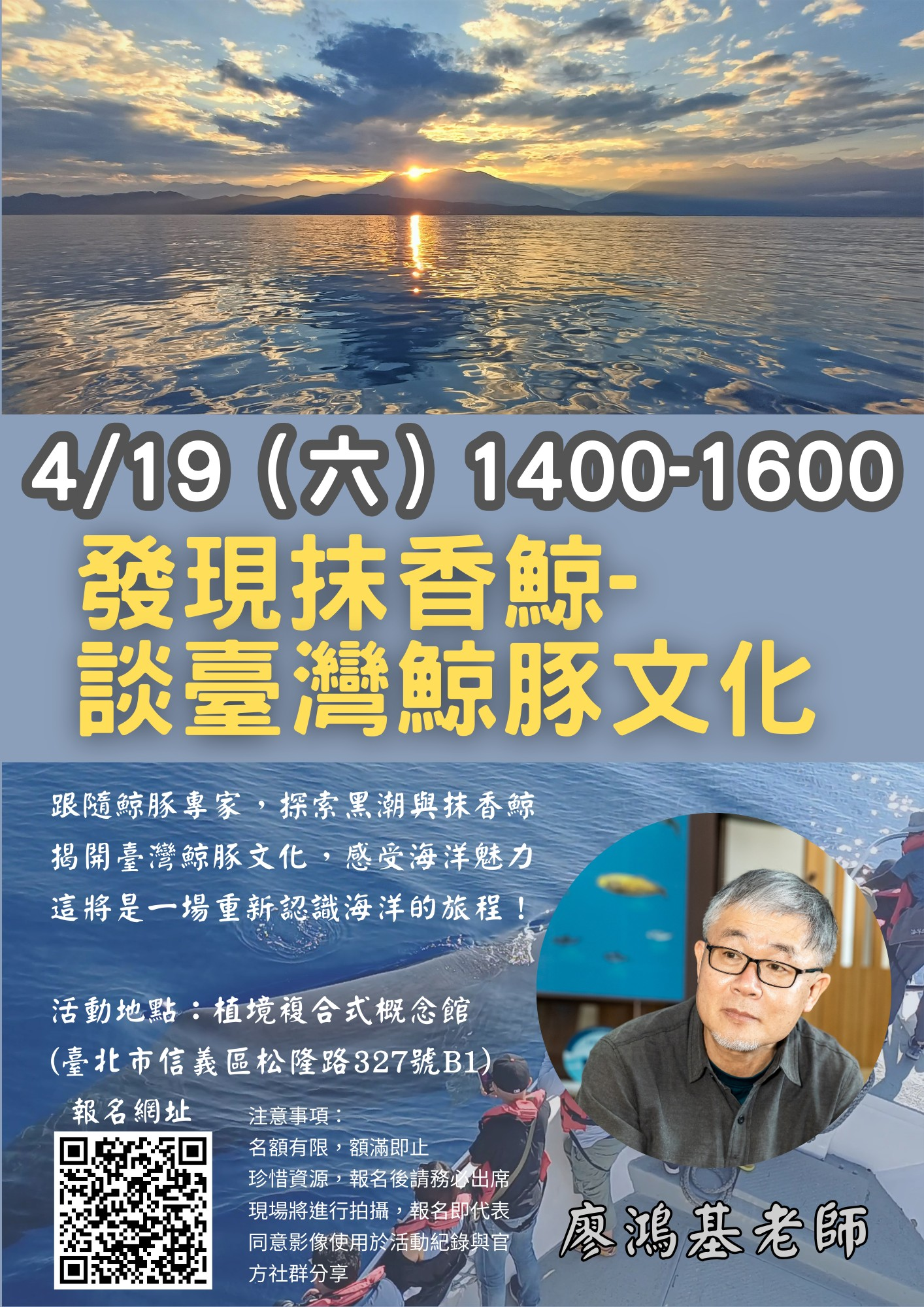 “Hearing the Voice of the Sea” — Liao Hung-chi on Sperm Whales and Taiwan’s Cetacean CultureSelected Ecology Lecture at the 2025 Roaming Xinyi Cultural & Lifestyle Festival