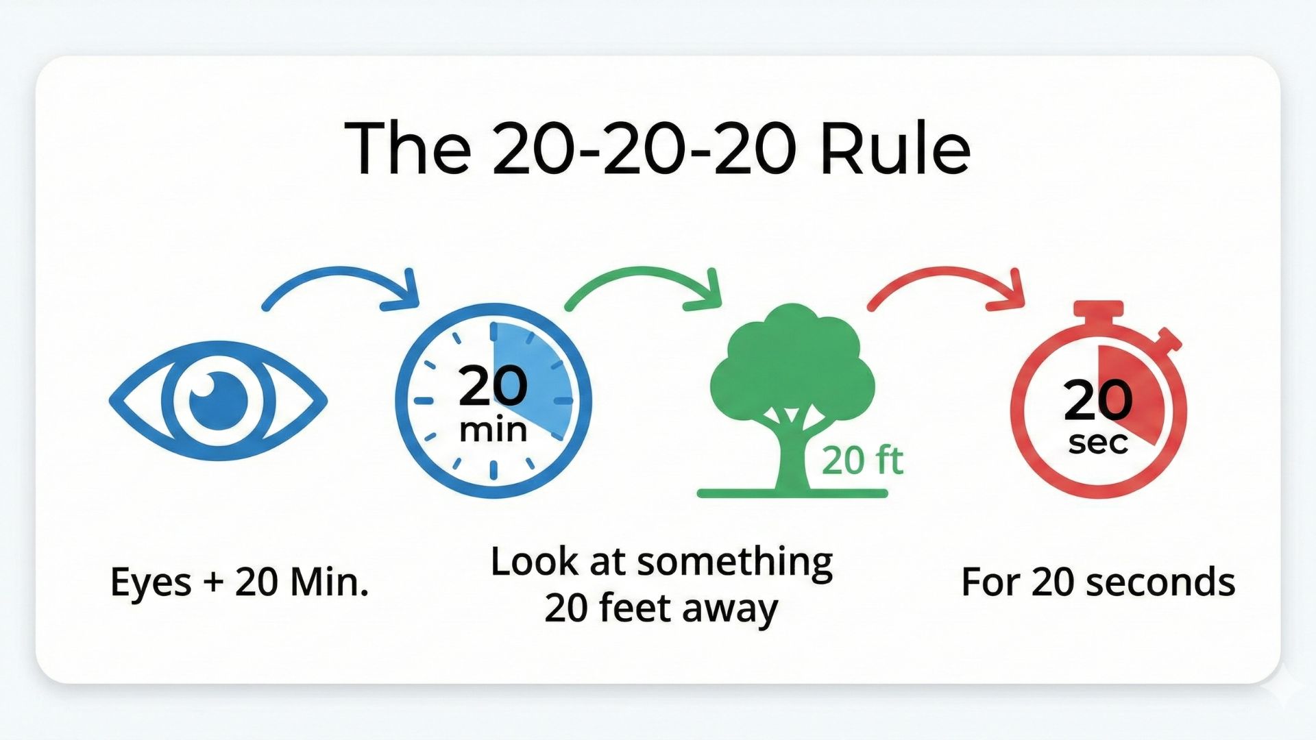 - Method: For every 20 minutes of screen use, look at something 20 feet (about 6 meters) away for at least 20 seconds.