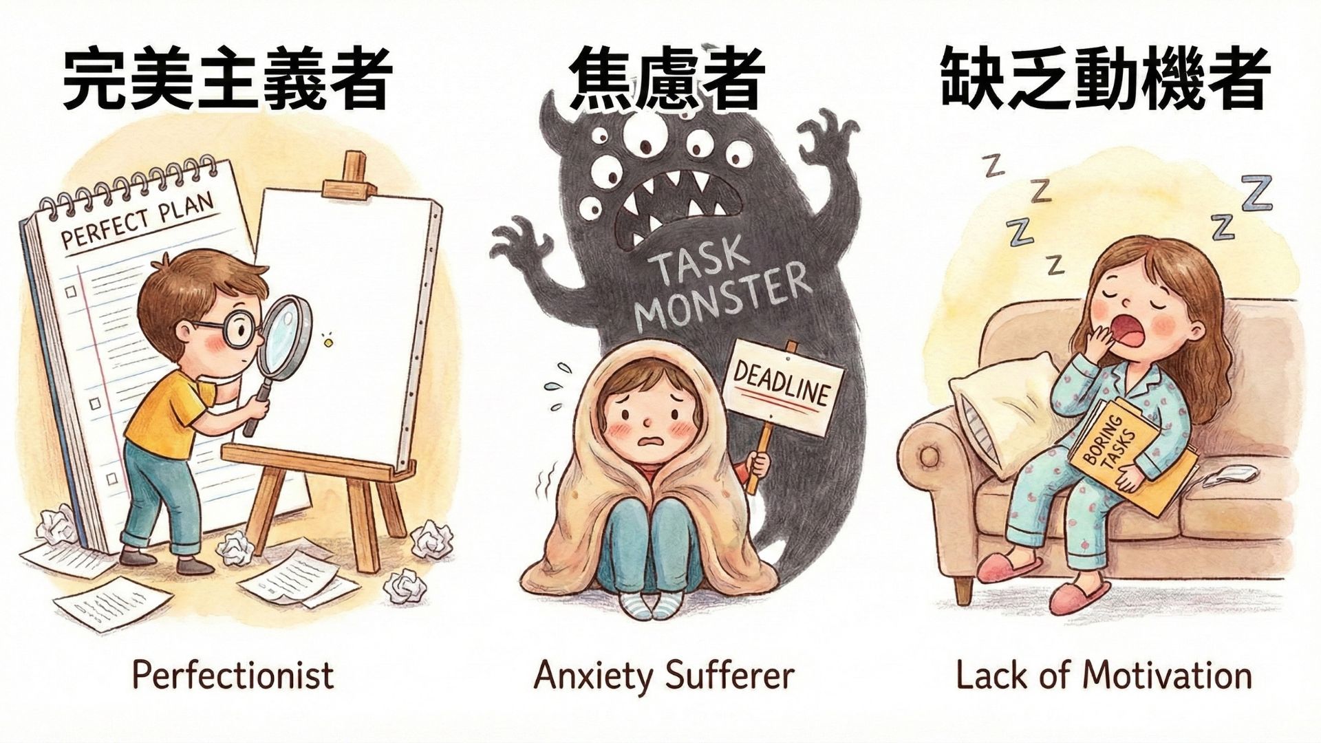 - 認知因素(完美主義): 「如果不夠完美,我寧願不做。」完美主義者往往有極高的自我要求,但這種心態反而造成巨大的心理壓力,導致行動癱瘓。